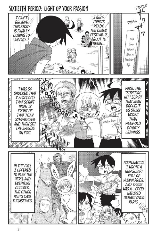 The school-aged hijinks of your favorite Attack on Titan characters come to a sad but hilarious end in this extra-long, 500-page volume!