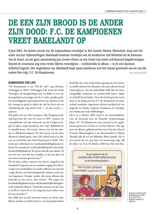 De verhalen zijn telkens ingeleid door tal van (strip)weetjes. Het rijkelijk geïllustreerde carrièrehoofdstuk brengt nog meer het succes van Hec Leemans’ andere stripreeks F.C. De Kampioenen in kaart, uiteindelijk ten koste van Bakelandt. Een ander, leerzaam historisch hoofdstuk vertelt dan weer over krijgsgeneeskunde in de Franse tijd van Bakelandt.