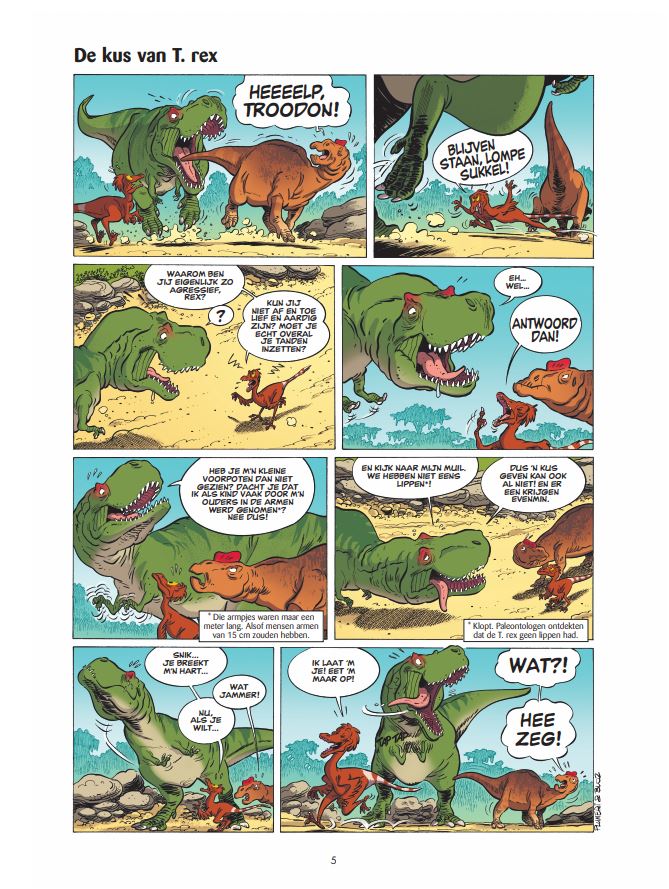 Gags op basis van recente wetenschappelijke ontdekkingen! Alle facetten van het leven van de dinosaurussen: levenswijze, vechtwijze, moederinstinct en ook het mysterie van hun uitsterven. Met handige steekkaarten van de belangrijkste dino's.