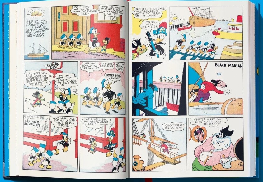 Barks’s synthesis of exaggerated cartoon characters with lush, realistic backgrounds, some researched from the pages of National Geographic magazine, created an entirely new art form, immersing readers in Donald’s triumphs and troubles. Introducing beloved supporting characters like identical nephews Huey, Dewey, and Louie, Scrooge McDuck, and lucky cousin Gladstone Gander, these escapades enthralled younger audiences but were far from childish. They were sophisticated, complex, and often dark tales of behavioral insight and graphic brilliance.