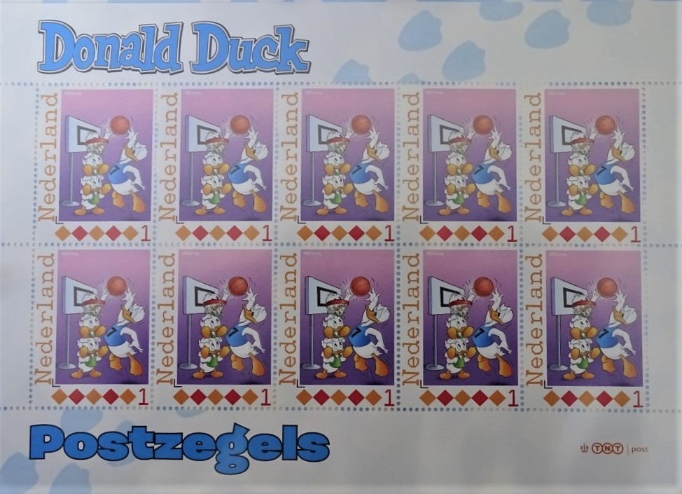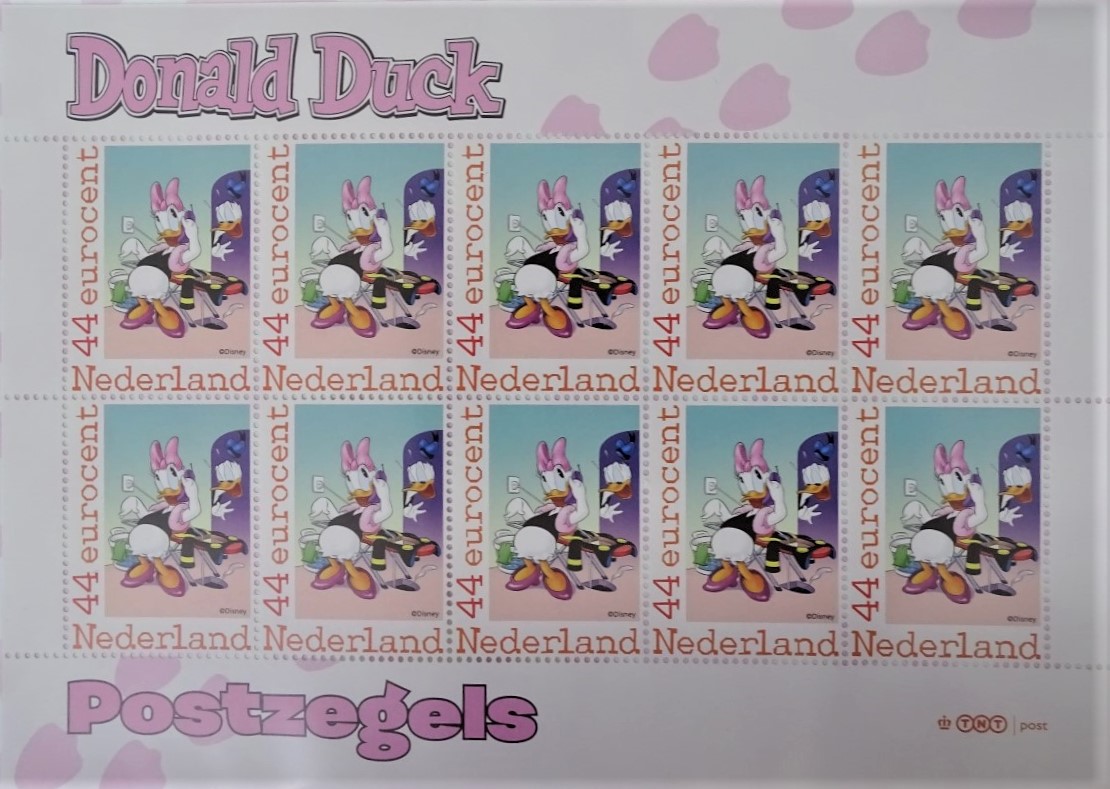 Elke pagina heeft aan de achterkant een postzegelvel met 10 zegels.