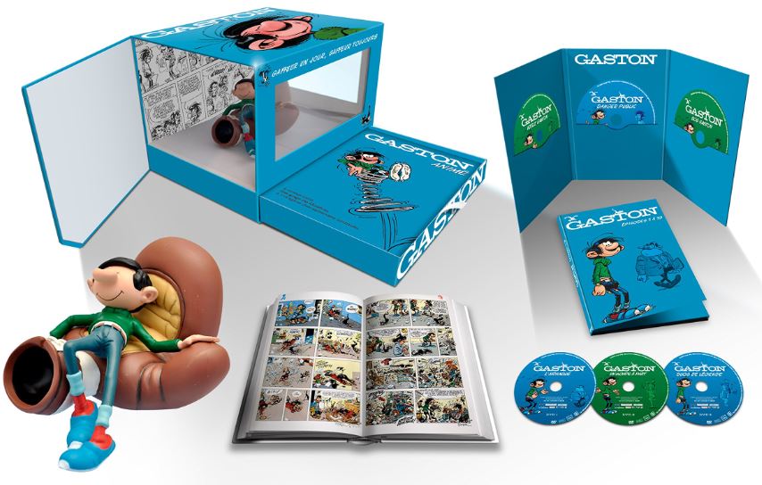 Franstalige box met het boek “Le Gaston Animé”, met twee “3DVD sets” (totaal dus 6 DVD’s) met daarop de Franse tekenfilmserie Gaston, en een Gaston Beeld (liggend op de boxhandschoen).