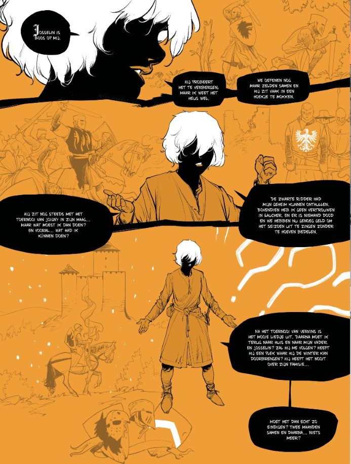 Tijdens een toernooi hoort Paulin, terwijl hij tussen de tenten wandelt, een verontrustende uitspraak: 'Het meisje zal sterven, in het strijdperk'. Maar er is maar een meisje in het strijdperk: Jehan. Zou het kunnen dat haar geheim is ontdekt? Is het leven van de jonge vrouw in gevaar? Ze is inderdaad alsmaar minder voorzichtig, de laatste tijd. Om zich te redden moeten onze vrienden nieuwe bondgenootschappen smeden met mensen die ze eerder als hun vijanden zagen: de zwarte ridder en Oddard, de huurling. Maar kunnen ze hun oude vetes opzijschuiven? De ridderwereld is een wereld vol geheimen en vechtpartijen.