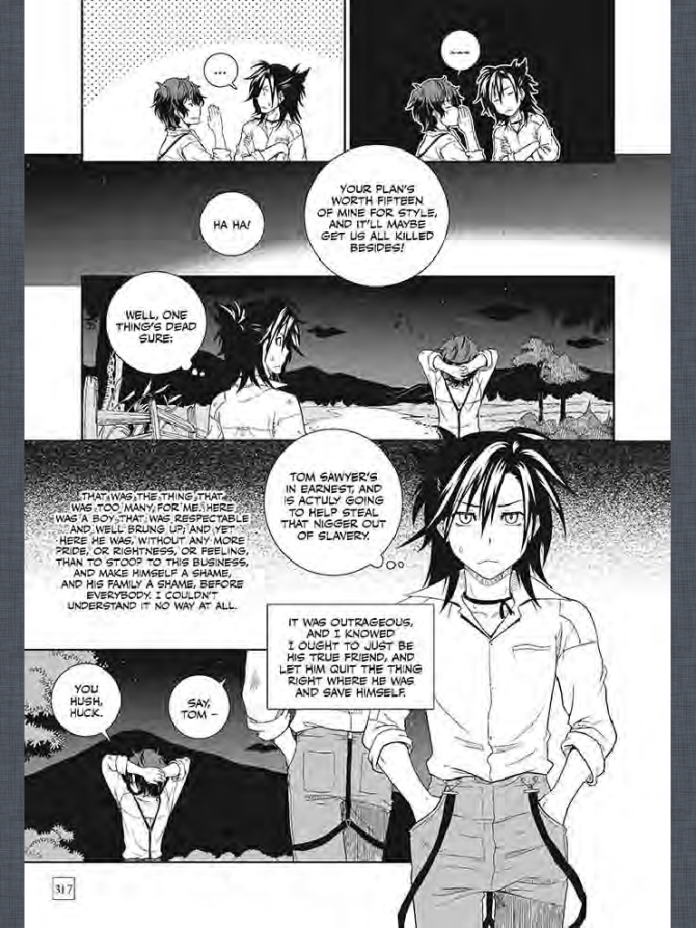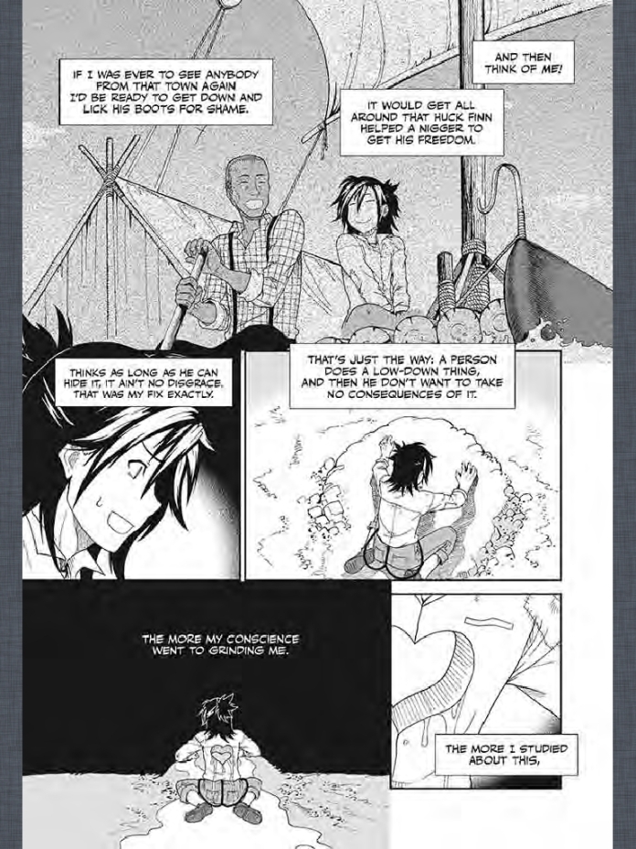 Chafed by the 'sivilized' restrictions of his foster home, and weary of his drunkard father's brutality, 14 year-old Huck Finn fakes his own death and sets off on a raft down the Mississippi River. He is soon joined by Jim, an escaped slave. Together, they experience a series of rollicking adventures that have amused readers, young and old, for over a century. The fugitives become close friends as they weather storms together aboard the raft and spend idyllic days swimming, frying catfish suppers, and enjoying their independence.