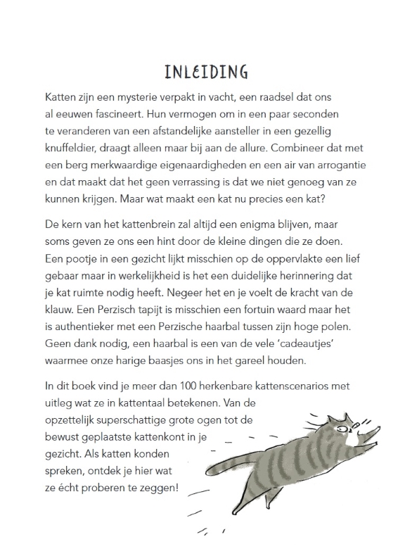 Heb jij je nooit afgevraagd wat je kat nou echt denkt? Dit boek is voor alle purrr-soonlijke assistenten die in dienst zijn bij een kat. Onze harige huisgenoten hebben zo hun eigen manieren om ons onder controle te houden en hun gevoelens duidelijk te maken – van een pets in je gezicht tot het vernielen van het mooie Perzische tapijt en van ongewenste ‘cadeautjes’ op de deurmat tot moordpogingen bovenaan de trap. Het is aan ons om te ontcijferen wat elke spin, blik en krab betekent. Dit handige gidsje met originele, geestige illustraties is een onmisbaar handboek voor iedereen die de kattencode wil kraken. Je leert wat er in die (o zo schattige) bolletjes omgaat aan de hand van meer dan 100 herkenbare scenario’s. Want als je hun taal niet goed spreekt, dan voel je onverbiddelijk de kracht van de klauw.