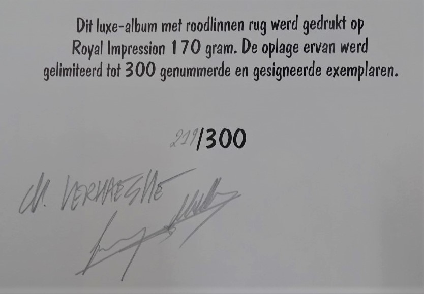 Door tekenaar en scenarist genummerd en gesigneerd door Verhaeghe en Matton