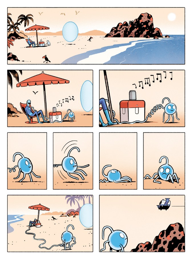 In this wordless comic book and its retro-futuristic aesthetics, Lucas Varela depicts a world where state, industry and media have joined forces to control a consumer citizenry, force-fed with junk food and inept contents. He also stages a wild story tinged with slapstick and dark humor.