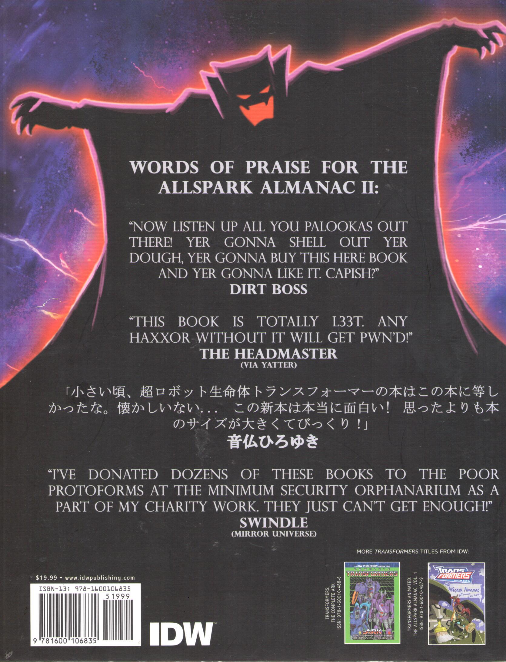 Transformers Animated is the most whimsical Transformers series ever. The AllSpark Almanac II captures that magic with a wondrous examination of this amazing universe. This 220 page volume is packed with behind-the-scenes sketches, interesting facts, production artwork and musings from the characters themselves. Relive the thrill of the final season of Animated and learn what might have been had the show continued. Explore the metallic plains of Cybertron and meet its colorful denizens. Discover more about the action-figures that accompanied the cartoon. Hard-core fans and neophytes alike will find this an essential tome. You won't want to miss it!