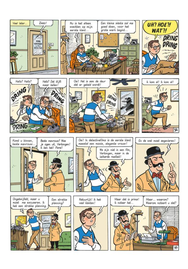 Bieke vindt dat Mark maar eindelijk eens een deftige baan moet zoeken. Mark besluit dat het beroep van privédetective misschien nog wel iets voor hem is. Hij vestigt zich in een kantoor zoals een echte detective en wacht op klanten. In detectiveromans is de eerste klant meestal een mooie blonde vrouw. Bij Mark is het echter Inspecteur Porei die zich aandient. Porei weet te vertellen dat je zonder vergunning niet zomaar voor detective mag spelen. Maar daar is een mouw aan te passen, als Mark de inspecteur helpt met een onderzoek.